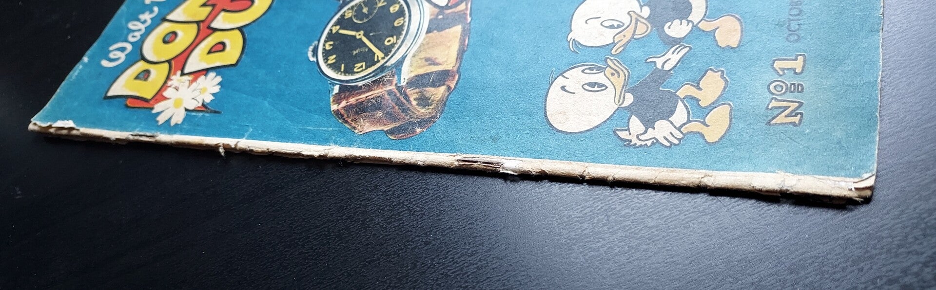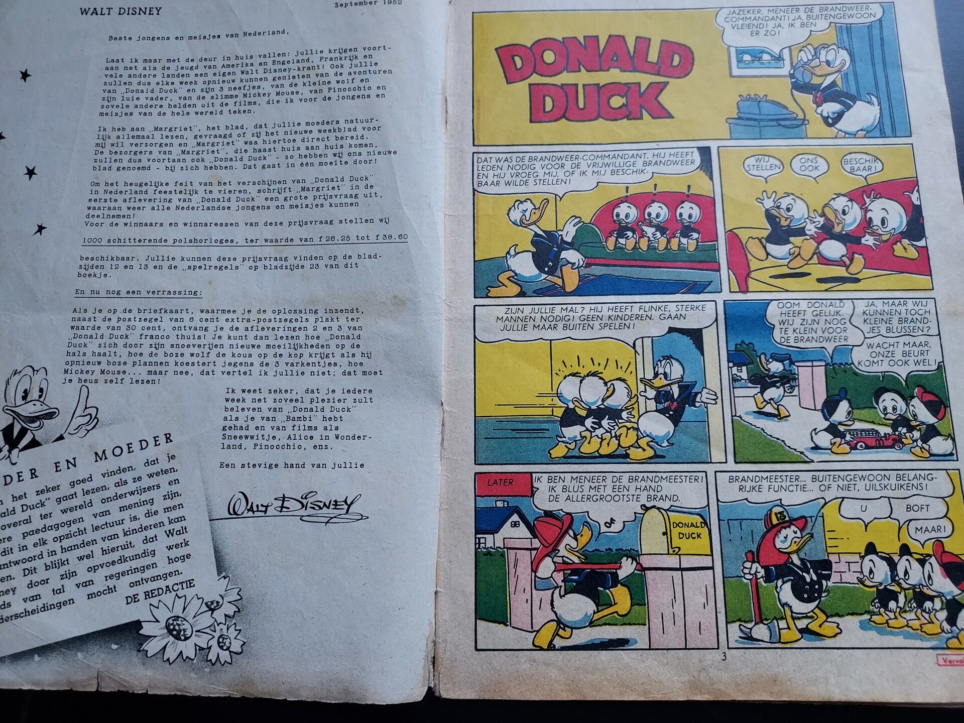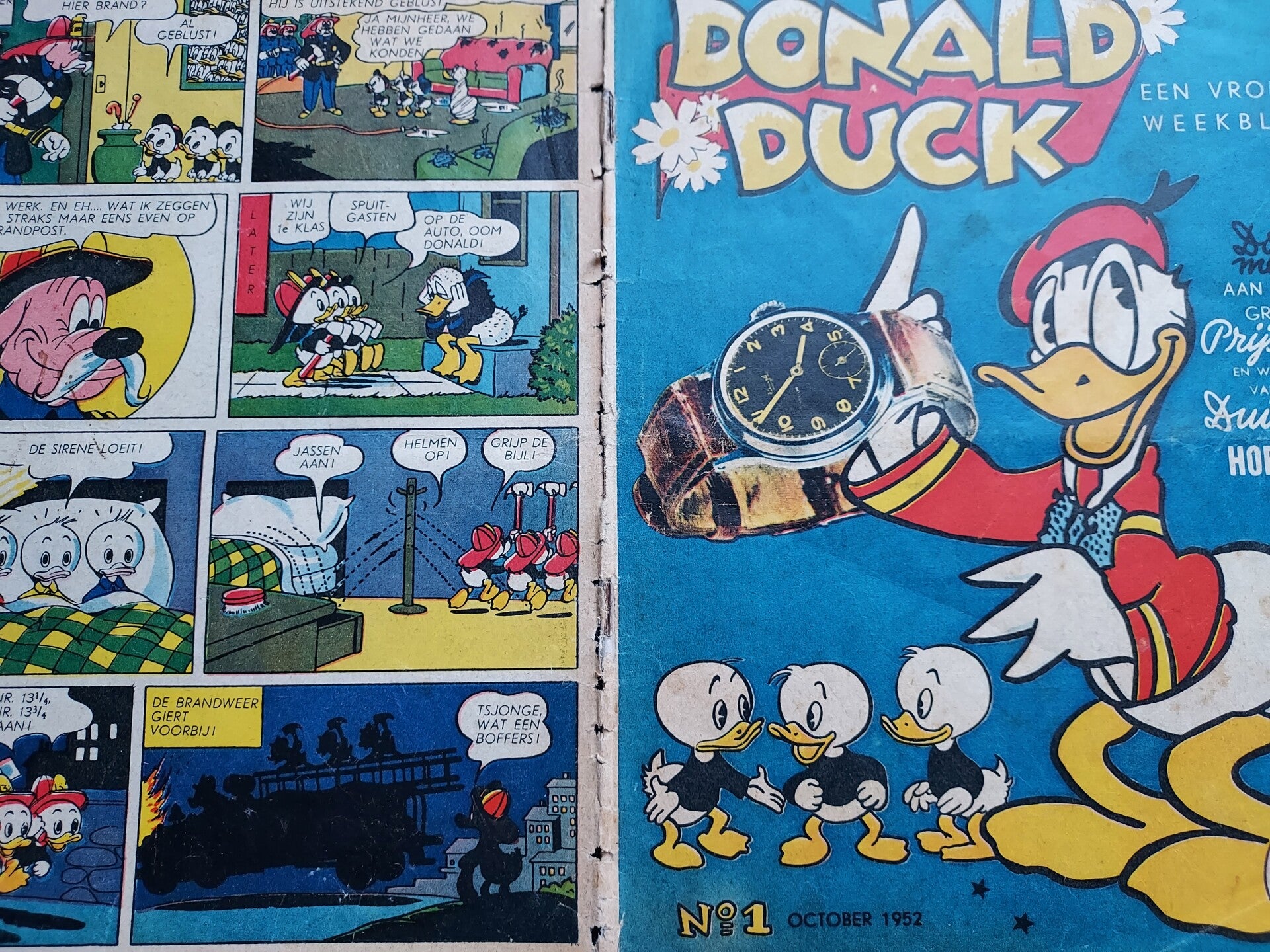 Origineel exemplaar van het allereerste nummer van het Donald Duck weekblad, uitgegeven in oktober 1952 door De Geïllustreerde Pers. Dit betreft een historisch waardevolle uitgave die het begin markeert van Donald Duck in Nederland.